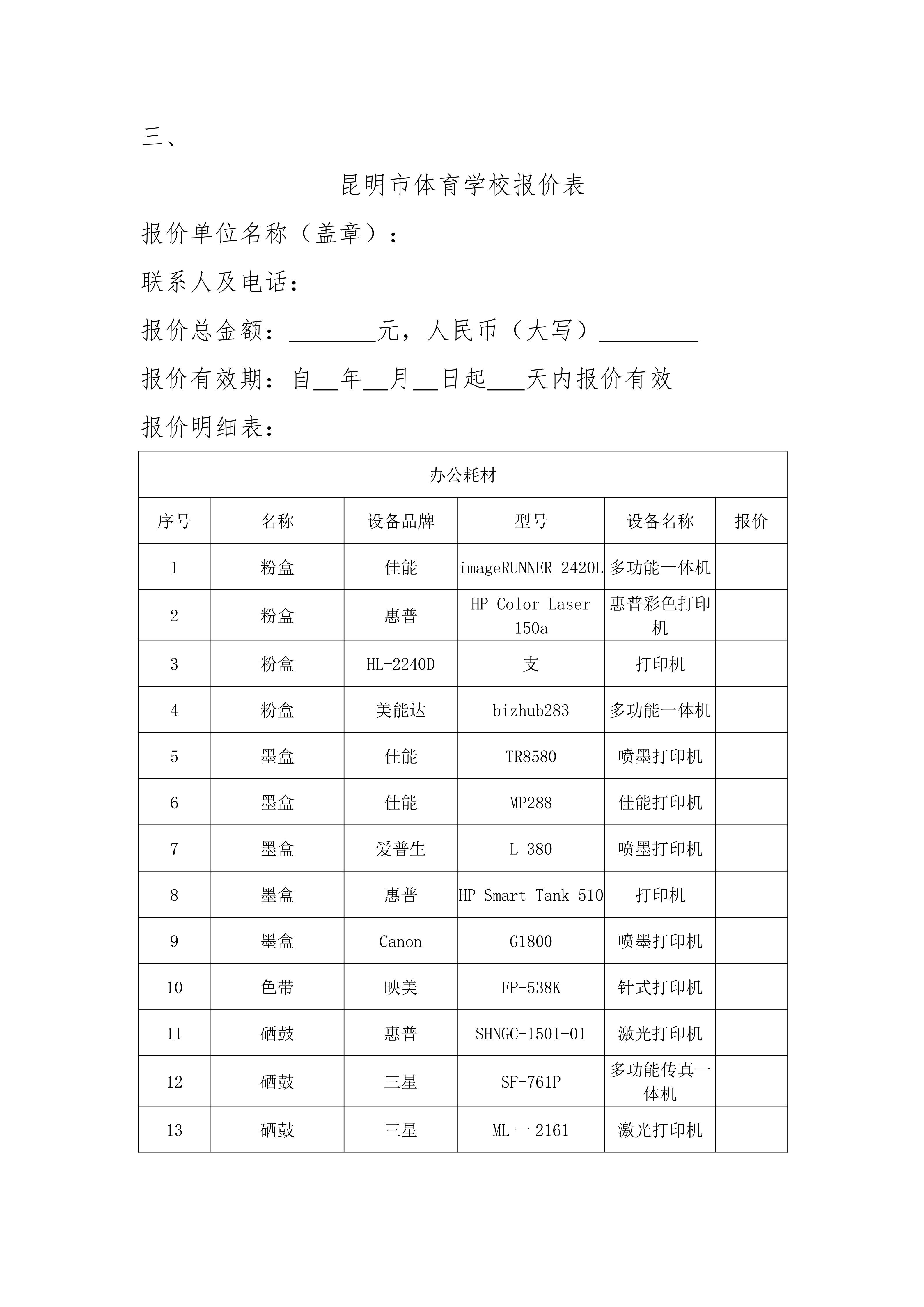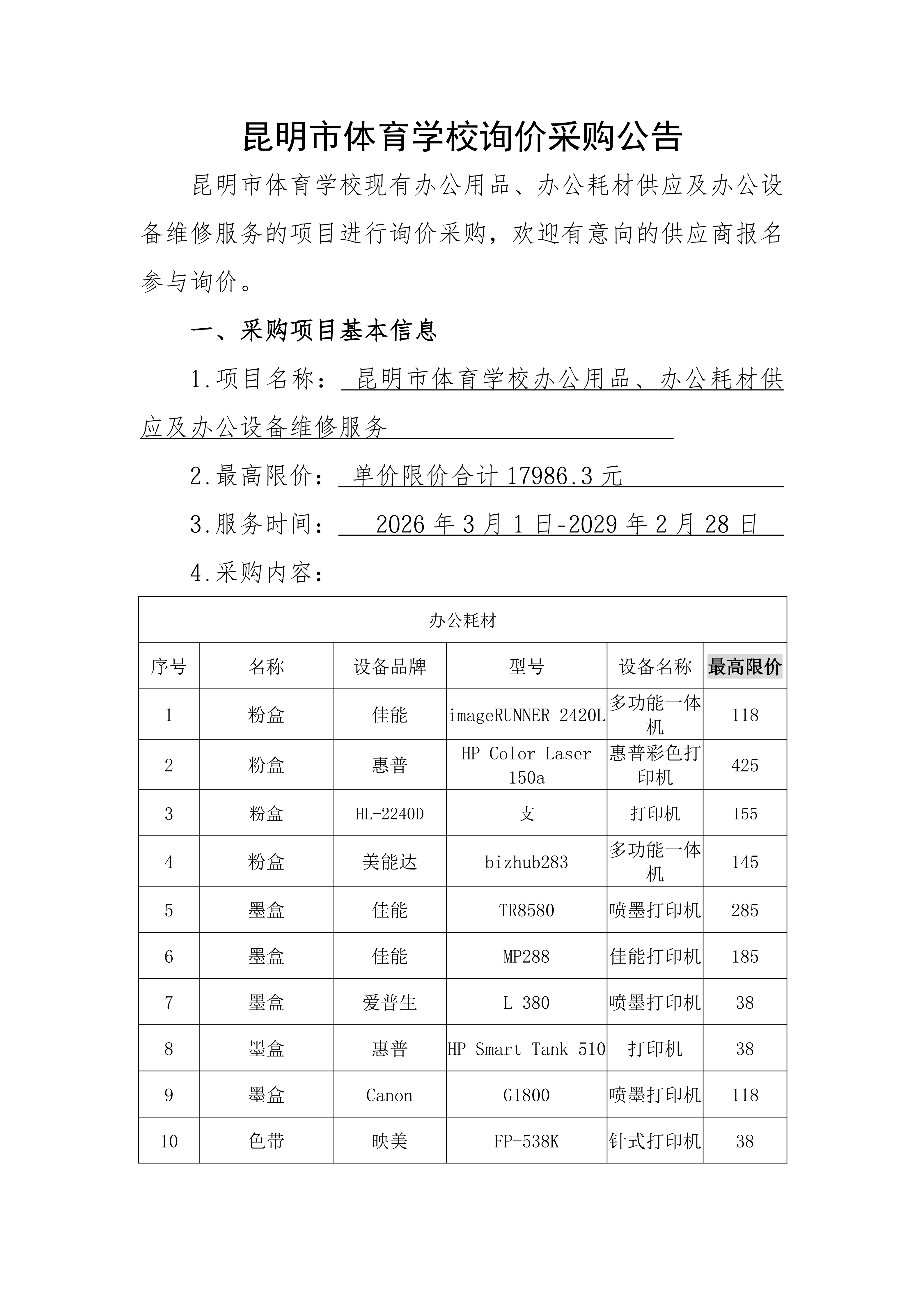 昆明市体育学校办公用品耗材及设备维修询价采购公告